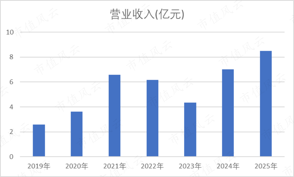 过去几年,公司的业绩曲线堪称过山车。营收方面,历经2022-2023年连跌两年后,终于在2024年有所回暖,为7.02亿元。2025年延续增势,同比增长20.82%至8.49亿元。