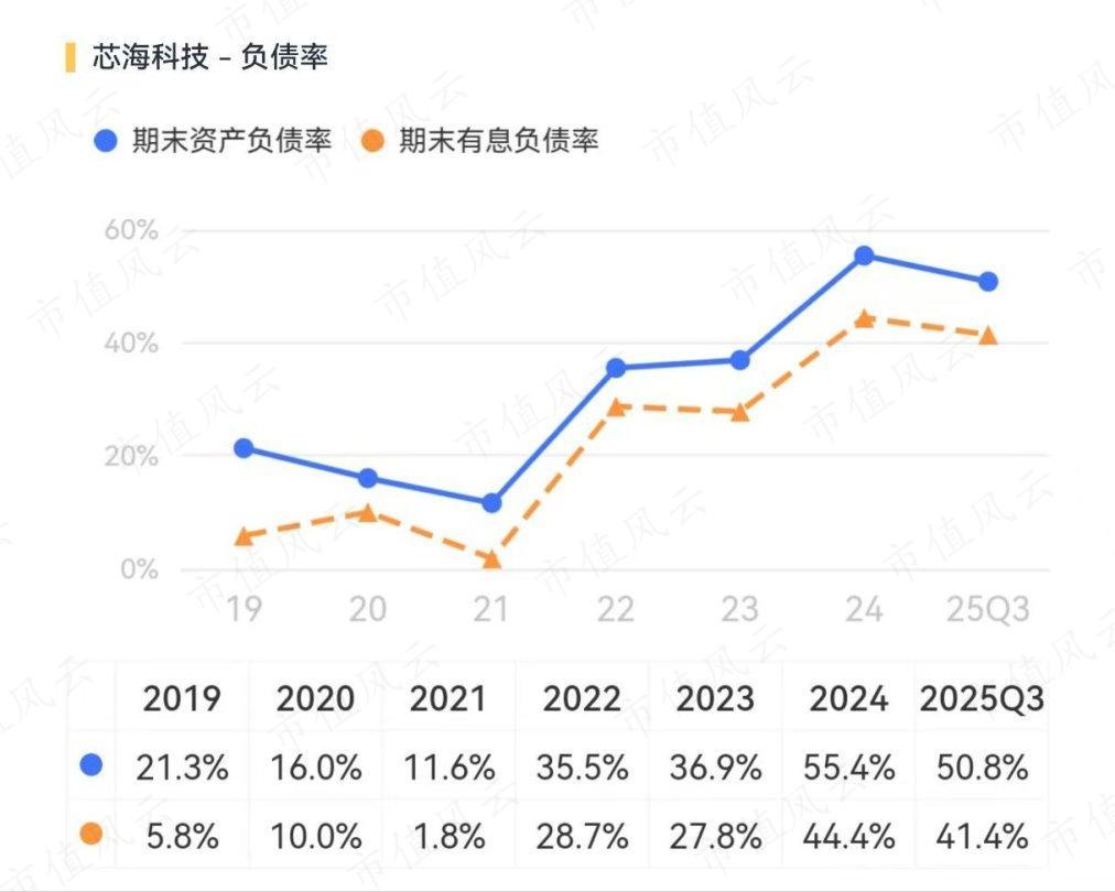 为此,公司只能依靠外部融资来维持运营、支撑研发。上市至今,公司已累计募资12.42亿元。负债率更是一路攀升,截至2025年9月末,有息负债率高达41.4%,整体资产负债率也达到50.8%,较2021年基本都增长了40个百分点。