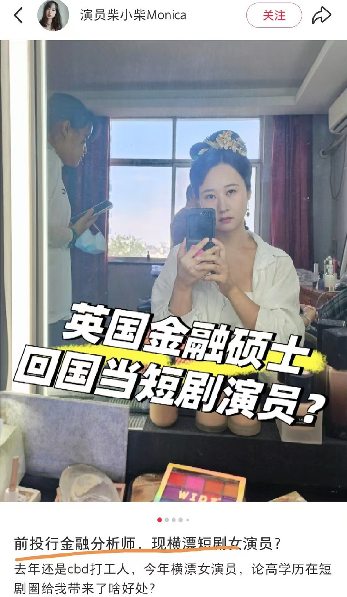 还有前投行分析师柴小柴,她的经历更魔幻,之前还是拿着高薪的CBD打工人,现在直接摇身一变成了横漂短剧演员。