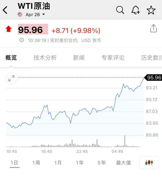 WTI原油同样大涨10%,每桶报96美元。